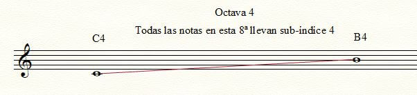 Esto quiere decir que desde este do hasta el si en sentido ascendente estaríamos en la octava 4, y todas las notas incluidas en esa octava llevarán el sub-índice 4.